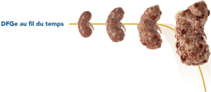Dans les cas de MPRAD, des kystes se forment généralement sur les deux reins. Au fil du temps, le nombre de kystes augmente, les kystes grossissent, et certains finissent par se rompre. On dit alors que la « maladie progresse ». La progression de la maladie peut varier grandement d’une personne à une autre, y compris entre les membres d’une même famille. Certaines personnes ressentent des symptômes de la progression de la maladie, par exemple des douleurs rénales. Même si vous n’avez pas encore de symptômes, des kystes se forment et croissent continuellement sur vos reins.